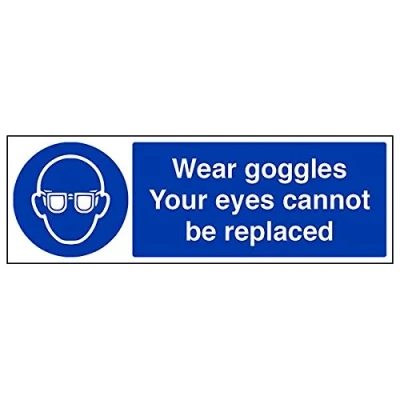 Helps to fulfil legal obligations to remind staff and visitors to wear the appropriate PPE when required to ensure personal safety as per Health and Safety (Safety Signs & Signals) Regulations 1996 Conforms to EN ISO 7010:2012 - Mandatory Signs feature a round symbol with a blue background of at least 50% of the total sign area, with a white pictogram and text Landscape Orientation. Sign reads "Wear Goggles. Your Eyes Cannot Be Replaced" Highly durable Self Adhesive Vinyl material and screen printed message will stand the test of time Sign measures 450 x 150mm. Self Adhesive material will adhere securely to most surfaces