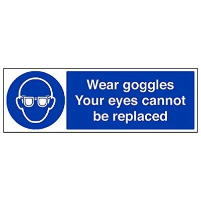 Helps to fulfil legal obligations to remind staff and visitors to wear the appropriate PPE when required to ensure personal safety as per Health and Safety (Safety Signs & Signals) Regulations 1996 Conforms to EN ISO 7010:2012 - Mandatory Signs feature a round symbol with a blue background of at least 50% of the total sign area, with a white pictogram and text Landscape Orientation. Sign reads "Wear Goggles. Your Eyes Cannot Be Replaced" Highly durable Self Adhesive Vinyl material and screen printed message will stand the test of time Sign measures 600 x 200mm. Self Adhesive material will adhere securely to most surfaces