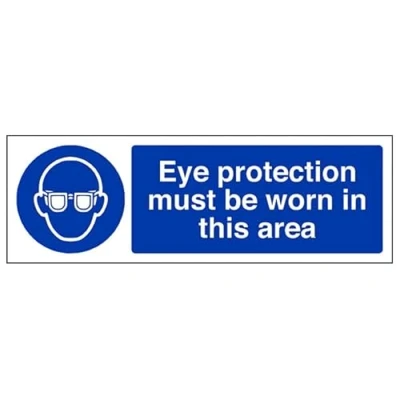 Helps to fulfil legal obligations to remind staff and visitors to wear the appropriate PPE when required to ensure personal safety as per Health and Safety (Safety Signs & Signals) Regulations 1996 Conforms to EN ISO 7010:2012 - Mandatory Signs feature a round symbol with a blue background of at least 50% of the total sign area, with a white pictogram and text Landscape Orientation. Sign reads "Eye Protection Must Be Worn In This Area" Highly durable Self Adhesive Vinyl material and screen printed message will stand the test of time Sign measures 450 x 150mm. Self Adhesive material will adhere securely to most surfaces