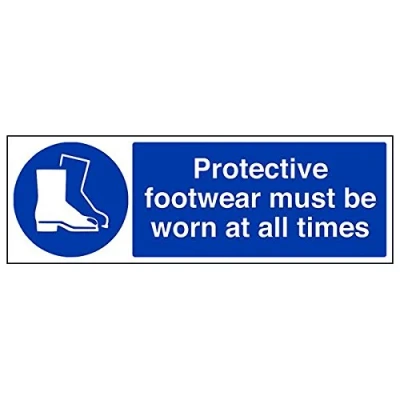 Helps to fulfil legal obligations to remind staff and visitors to wear the appropriate PPE when required to ensure personal safety as per Health and Safety (Safety Signs & Signals) Regulations 1996 Conforms to EN ISO 7010:2012 - Mandatory Signs feature a round symbol with a blue background of at least 50% of the total sign area, with a white pictogram and text Landscape Orientation. Sign reads "Protective Footwear Must Be Worn At All Times" Highly durable 1mm plastic material and screen printed message will stand the test of time Sign measures 450 x 150mm.