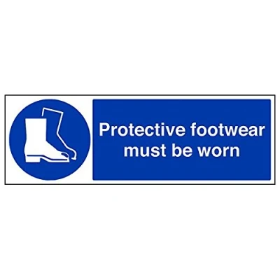 Helps to fulfil legal obligations to remind staff and visitors to wear the appropriate PPE when required to ensure personal safety as per Health and Safety (Safety Signs & Signals) Regulations 1996 Conforms to EN ISO 7010:2012 - Mandatory Signs feature a round symbol with a blue background of at least 50% of the total sign area, with a white pictogram and text Landscape Orientation. Sign reads "Protective Footwear Must Be Worn" Highly durable Self Adhesive Vinyl material and screen printed message will stand the test of time Sign measures 600 x 200mm. Self Adhesive material will adhere securely to most surfaces
