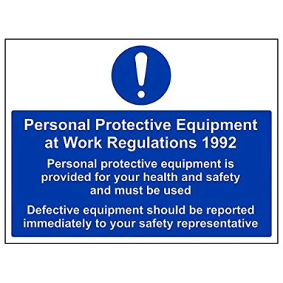 Helps to fulfil legal obligations to remind staff and visitors to wear the appropriate PPE when required to ensure personal safety as per Health and Safety (Safety Signs & Signals) Regulations 1996 Conforms to EN ISO 7010:2012 - Mandatory Signs feature a round symbol with a blue background of at least 50% of the total sign area, with a white pictogram and text Landscape Orientation. Sign reads "Personal Protective Equipment At Work Regulations 1992. Personal Protective Equipment Is Provided For Your Health And Safety And Must Be Used" Highly durable Self Adhesive Vinyl material and screen printed message will stand the test of time Sign measures 400 x 300mm. Self Adhesive material will adhere securely to most surfaces
