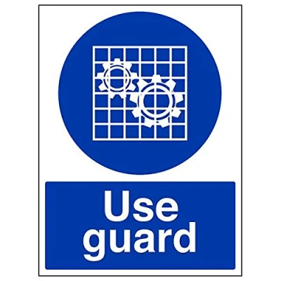 Helps to fulfil legal obligations to advise employees and visitors of specific actions and behaviour which must be adhered to in order to ensure personal safety as per Health and Safety (Safety Signs & Signals) Regulations 1996 Conforms to EN ISO 7010:2012 - Mandatory Signs feature a round symbol with a blue background of at least 50% of the total sign area, with a white pictogram and text Portrait Orientation. Sign reads "Use Guard" Highly durable 1mm plastic material and screen printed message will stand the test of time Sign measures 300 x 400mm.
