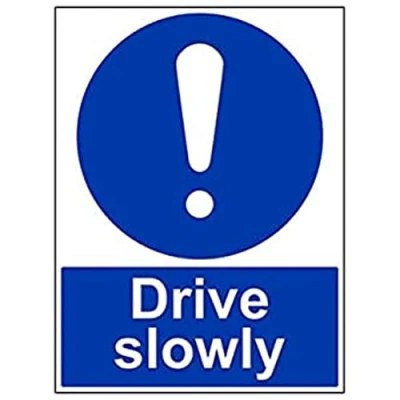 Helps to fulfil legal obligations to advise employees and visitors of specific actions and behaviour which must be adhered to in order to ensure personal safety as per Health and Safety (Safety Signs & Signals) Regulations 1996 Conforms to EN ISO 7010:2012 - Mandatory Signs feature a round symbol with a blue background of at least 50% of the total sign area, with a white pictogram and text Portrait Orientation. Sign reads "Drive Slowly" Highly durable 1mm plastic material and screen printed message will stand the test of time Sign measures 450 x 600mm.