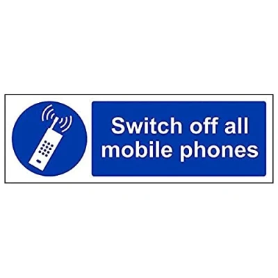 Helps to fulfil legal obligations to advise employees and visitors of specific actions and behaviour which must be adhered to in order to ensure personal safety as per Health and Safety (Safety Signs & Signals) Regulations 1996 Conforms to EN ISO 7010:2012 - Mandatory Signs feature a round symbol with a blue background of at least 50% of the total sign area, with a white pictogram and text Landscape Orientation. Sign reads "Switch Off All Mobile Phones" Highly durable 1mm plastic material and screen printed message will stand the test of time Sign measures 300 x 100mm.