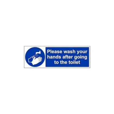 Helps to fulfil legal obligations to advise employees and visitors of specific actions and behaviour which must be adhered to in order to ensure personal safety as per Health and Safety (Safety Signs & Signals) Regulations 1996 Conforms to EN ISO 7010:2012 - Mandatory Signs feature a round symbol with a blue background of at least 50% of the total sign area, with a white pictogram and text Landscape Orientation. Sign reads "Please Wash Your Hands After Going To The Toilet" Highly durable 1mm plastic material and screen printed message will stand the test of time Sign measures 600 x 200mm.