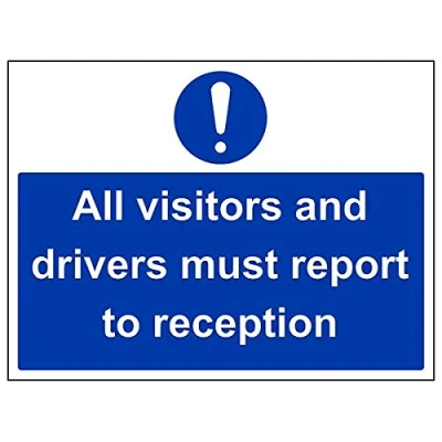 Helps to fulfil legal obligations to advise employees and visitors of specific actions and behaviour which must be adhered to in order to ensure personal safety as per Health and Safety (Safety Signs & Signals) Regulations 1996 Conforms to EN ISO 7010:2012 - Mandatory Signs feature a round symbol with a blue background of at least 50% of the total sign area, with a white pictogram and text Landscape Orientation. Sign reads "All Visitors and Drivers Must Report To Reception" Highly durable 1mm plastic material and screen printed message will stand the test of time Sign measures 400 x 300mm.