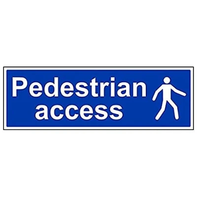 Helps to fulfil legal obligations to advise employees and visitors of specific actions and behaviour which must be adhered to in order to ensure personal safety as per Health and Safety (Safety Signs & Signals) Regulations 1996 Conforms to EN ISO 7010:2012 - Mandatory Signs feature a round symbol with a blue background of at least 50% of the total sign area, with a white pictogram and text Landscape Orientation. Sign reads "Pedestrian Access" Highly durable Self Adhesive Vinyl material and screen printed message will stand the test of time Sign measures 600 x 200mm. Self Adhesive material will adhere securely to most surfaces
