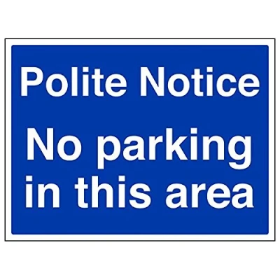 Helps to fulfil legal obligations to advise employees and visitors of specific actions and behaviour which must be adhered to in order to ensure personal safety as per Health and Safety (Safety Signs & Signals) Regulations 1996 Conforms to EN ISO 7010:2012 - Mandatory Signs feature a round symbol with a blue background of at least 50% of the total sign area, with a white pictogram and text Landscape Orientation. Sign reads "Polite Notice. No Parking In This Area" Highly durable 1mm plastic material and screen printed message will stand the test of time Sign measures 400 x 300mm.