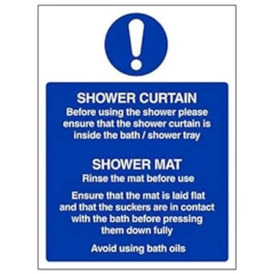 Helps to fulfil legal obligations to advise employees and visitors of specific actions and behaviour which must be adhered to in order to ensure personal safety as per Health and Safety (Safety Signs & Signals) Regulations 1996 Conforms to EN ISO 7010:2012 - Mandatory Signs feature a round symbol with a blue background of at least 50% of the total sign area, with a white pictogram and text Portrait Orientation. Sign reads "Before Using The Shower Please Ensure That The Shower Curtain Is Inside The Bath/Shower Tray. Rinse The Mat Before Use" Highly durable Self Adhesive Vinyl material and screen printed message will stand the test of time Sign measures 150 x 200mm. Self Adhesive material will adhere securely to most surfaces