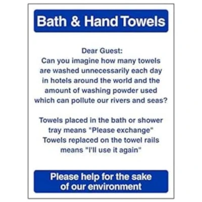Helps to fulfil legal obligations to advise employees and visitors of specific actions and behaviour which must be adhered to in order to ensure personal safety as per Health and Safety (Safety Signs & Signals) Regulations 1996 Conforms to EN ISO 7010:2012 - Mandatory Signs feature a round symbol with a blue background of at least 50% of the total sign area, with a white pictogram and text Portrait Orientation. Sign reads "Bath & Hand Towels. Towels Placed In The Bath or Shower Tray Means: Please Exchange. Towels Replaced On The Towel Rails Means: I'll Use It Again" Highly durable Self Adhesive Vinyl material and screen printed message will stand the test of time Sign measures 150 x 200mm. Self Adhesive material will adhere securely to most surfaces