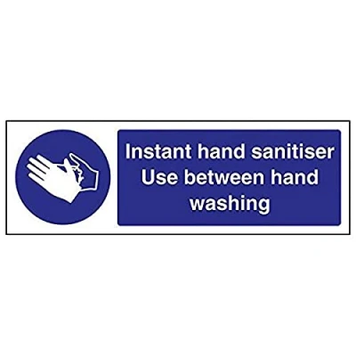 Helps to fulfil legal obligations to advise employees and visitors of specific actions and behaviour which must be adhered to in order to ensure personal safety as per Health and Safety (Safety Signs & Signals) Regulations 1996 Conforms to EN ISO 7010:2012 - Mandatory Signs feature a round symbol with a blue background of at least 50% of the total sign area, with a white pictogram and text Landscape Orientation. Sign reads "Instant Hand Sanitiser. Use Between Hand Washing" Highly durable 1mm plastic material and screen printed message will stand the test of time Sign measures 300 x 100mm.