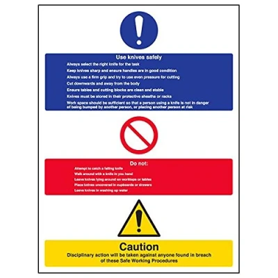 Helps to fulfil legal obligations to remind staff and visitors to wear the appropriate PPE in catering environments to ensure personal safety and maintain hygiene levels Conforms to EN ISO 7010:2012 - Mandatory Signs feature a round symbol with a blue background of at least 50% of the total sign area, with a white pictogram and text Portrait Orientation. Sign reads "Use Knives Safely. Always Select The Right Knife For The Task. Keep Knives Sharp And Ensure Handles Are In Good Condition" Highly durable 1mm plastic material and screen printed message will stand the test of time Sign measures 300 x 400mm.