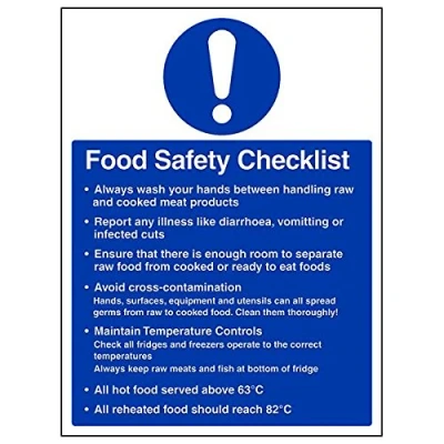 Helps to fulfil legal obligations to remind staff and visitors to wear the appropriate PPE in catering environments to ensure personal safety and maintain hygiene levels Conforms to EN ISO 7010:2012 - Mandatory Signs feature a round symbol with a blue background of at least 50% of the total sign area, with a white pictogram and text Portrait Orientation. Sign reads "Food Safety Checklist. Always Wash Your Hands Between Handling Raw And Cooked Meat Products. Report Any Illness Like Diarrhoea, Vomiting or Infected Cuts" Highly durable 1mm plastic material and screen printed message will stand the test of time Sign measures 300 x 400mm.