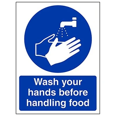 Helps to fulfil legal obligations to remind staff and visitors to wear the appropriate PPE in catering environments to ensure personal safety and maintain hygiene levels Conforms to EN ISO 7010:2012 - Mandatory Signs feature a round symbol with a blue background of at least 50% of the total sign area, with a white pictogram and text Portrait Orientation. Sign reads "Wash Your Hands Before Handling Food" Highly durable 1mm plastic material and screen printed message will stand the test of time Sign measures 150 x 200mm.