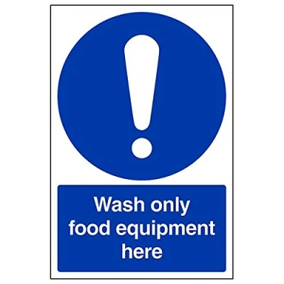 Helps to fulfil legal obligations to remind staff and visitors to wear the appropriate PPE in catering environments to ensure personal safety and maintain hygiene levels Conforms to EN ISO 7010:2012 - Mandatory Signs feature a round symbol with a blue background of at least 50% of the total sign area, with a white pictogram and text Portrait Orientation. Sign reads "Wash Only Food Equipment Here" Highly durable Self Adhesive Vinyl material and screen printed message will stand the test of time Sign measures 200 x 300mm. Self Adhesive material will adhere securely to most surfaces