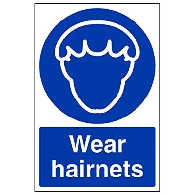Helps to fulfil legal obligations to remind staff and visitors to wear the appropriate PPE in catering environments to ensure personal safety and maintain hygiene levels Conforms to EN ISO 7010:2012 - Mandatory Signs feature a round symbol with a blue background of at least 50% of the total sign area, with a white pictogram and text Portrait Orientation. Sign reads "Wear Hairnets" Highly durable Self Adhesive Vinyl material and screen printed message will stand the test of time Sign measures 200 x 300mm. Self Adhesive material will adhere securely to most surfaces