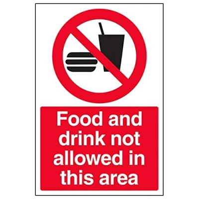 Helps to fulfil legal obligations to remind staff and visitors to wear the appropriate PPE in catering environments to ensure personal safety and maintain hygiene levels Conforms to EN ISO 7010:2012 - Mandatory Signs feature a round symbol with a blue background of at least 50% of the total sign area, with a white pictogram and text Portrait Orientation. Sign reads "Food And Drink Not Allowed In This Area" Highly durable Self Adhesive Vinyl material and screen printed message will stand the test of time Sign measures 200 x 300mm. Self Adhesive material will adhere securely to most surfaces