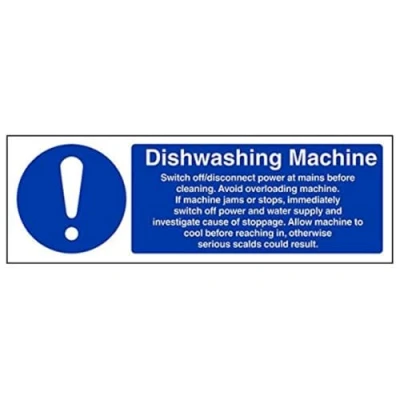 Helps to fulfil legal obligations to remind staff and visitors to wear the appropriate PPE in catering environments to ensure personal safety and maintain hygiene levels Conforms to EN ISO 7010:2012 - Mandatory Signs feature a round symbol with a blue background of at least 50% of the total sign area, with a white pictogram and text Landscape Orientation. Sign reads "Dishwashing Machine. Switch Off/Disconnect Power At Mains Before Cleaning. Avoid Overloading Machine" Highly durable Self Adhesive Vinyl material and screen printed message will stand the test of time Sign measures 300 x 100mm. Self Adhesive material will adhere securely to most surfaces