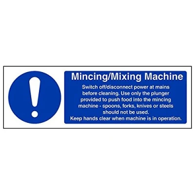 Helps to fulfil legal obligations to remind staff and visitors to wear the appropriate PPE in catering environments to ensure personal safety and maintain hygiene levels Conforms to EN ISO 7010:2012 - Mandatory Signs feature a round symbol with a blue background of at least 50% of the total sign area, with a white pictogram and text Landscape Orientation. Sign reads "Mincing/Mixing Machine. Switch Off/Disconnect Power At Mains Before Cleaning. Use Only The Plunger Provided To Push Food Into The Mincing Machine" Highly durable 1mm plastic material and screen printed message will stand the test of time Sign measures 300 x 100mm.