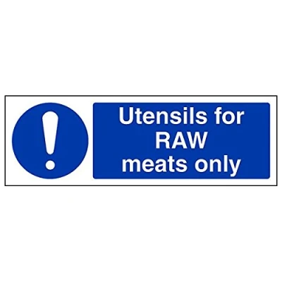 Helps to fulfil legal obligations to remind staff and visitors to wear the appropriate PPE in catering environments to ensure personal safety and maintain hygiene levels Conforms to EN ISO 7010:2012 - Mandatory Signs feature a round symbol with a blue background of at least 50% of the total sign area, with a white pictogram and text Landscape Orientation. Sign reads "Utensils For Raw Meats Only" Highly durable Self Adhesive Vinyl material and screen printed message will stand the test of time Sign measures 300 x 100mm. Self Adhesive material will adhere securely to most surfaces