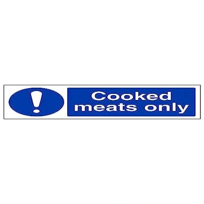 Helps to fulfil legal obligations to remind staff and visitors to wear the appropriate PPE in catering environments to ensure personal safety and maintain hygiene levels Conforms to EN ISO 7010:2012 - Mandatory Signs feature a round symbol with a blue background of at least 50% of the total sign area, with a white pictogram and text Landscape Orientation. Sign reads "Cooked Meats Only" Highly durable Self Adhesive Vinyl material and screen printed message will stand the test of time Sign measures 300 x 100mm. Self Adhesive material will adhere securely to most surfaces