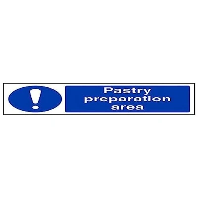 Helps to fulfil legal obligations to remind staff and visitors to wear the appropriate PPE in catering environments to ensure personal safety and maintain hygiene levels Conforms to EN ISO 7010:2012 - Mandatory Signs feature a round symbol with a blue background of at least 50% of the total sign area, with a white pictogram and text Landscape Orientation. Sign reads "Pastry Preparation Area" Highly durable Self Adhesive Vinyl material and screen printed message will stand the test of time Sign measures 300 x 100mm. Self Adhesive material will adhere securely to most surfaces