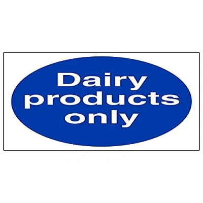 Helps to fulfil legal obligations to remind staff and visitors to wear the appropriate PPE in catering environments to ensure personal safety and maintain hygiene levels Conforms to EN ISO 7010:2012 - Mandatory Signs feature a round symbol with a blue background of at least 50% of the total sign area, with a white pictogram and text Square Orientation. Sign reads "Dairy Products Only" Highly durable Self Adhesive Vinyl material and screen printed message will stand the test of time Sign measures 200 x 200mm. Self Adhesive material will adhere securely to most surfaces