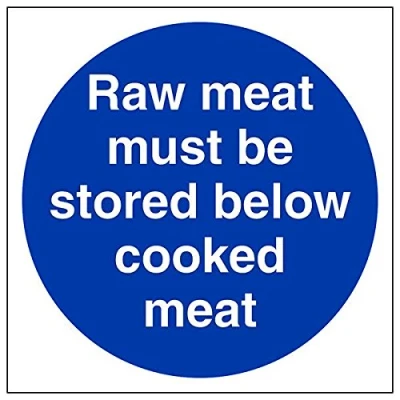 Helps to fulfil legal obligations to remind staff and visitors to wear the appropriate PPE in catering environments to ensure personal safety and maintain hygiene levels Conforms to EN ISO 7010:2012 - Mandatory Signs feature a round symbol with a blue background of at least 50% of the total sign area, with a white pictogram and text Square Orientation. Sign reads "Raw Meat Must Be Stored Below Cooked Meat" Highly durable Self Adhesive Vinyl material and screen printed message will stand the test of time Sign measures 200 x 200mm. Self Adhesive material will adhere securely to most surfaces