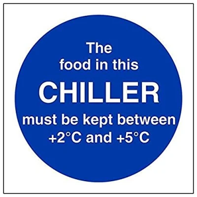 Helps to fulfil legal obligations to remind staff and visitors to wear the appropriate PPE in catering environments to ensure personal safety and maintain hygiene levels Conforms to EN ISO 7010:2012 - Mandatory Signs feature a round symbol with a blue background of at least 50% of the total sign area, with a white pictogram and text Square Orientation. Sign reads "The Food In This Chiller Must Be Kept Between +2°c and +5°c" Highly durable Self Adhesive Vinyl material and screen printed message will stand the test of time Sign measures 100 x 100mm. Self Adhesive material will adhere securely to most surfaces
