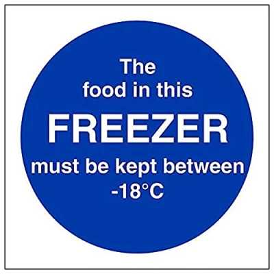 Helps to fulfil legal obligations to remind staff and visitors to wear the appropriate PPE in catering environments to ensure personal safety and maintain hygiene levels Conforms to EN ISO 7010:2012 - Mandatory Signs feature a round symbol with a blue background of at least 50% of the total sign area, with a white pictogram and text Square Orientation. Sign reads "The Food In This Freezer Must Be At or Below -18°c" Highly durable Self Adhesive Vinyl material and screen printed message will stand the test of time Sign measures 100 x 100mm. Self Adhesive material will adhere securely to most surfaces