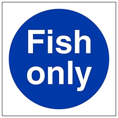 Helps to fulfil legal obligations to remind staff and visitors to wear the appropriate PPE in catering environments to ensure personal safety and maintain hygiene levels Conforms to EN ISO 7010:2012 - Mandatory Signs feature a round symbol with a blue background of at least 50% of the total sign area, with a white pictogram and text Square Orientation. Sign reads "Fish Only" Highly durable Self Adhesive Vinyl material and screen printed message will stand the test of time Sign measures 100 x 100mm. Self Adhesive material will adhere securely to most surfaces