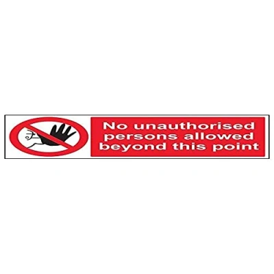Clearly displays prohibited and potentially dangerous actions which employees and visitors must avoid in the interests of health and safety as per Health and Safety (Safety Signs & Signals) Regulations 1996 Conforms to EN ISO 7010:2012 - Prohibition signs feature a red circular symbol of at least 35% of the total sign area, on a white background, with a black pictogram Landscape Orientation. Sign reads "No Unauthorised Persons Allowed Beyond This Point" Highly durable Self Adhesive Vinyl material and screen printed message will stand the test of time Sign measures 600 x 200mm. Self Adhesive material will adhere securely to most surfaces