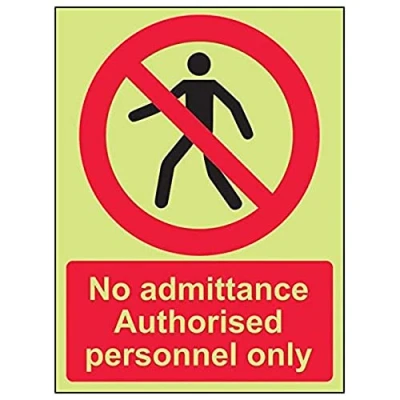 Clearly displays prohibited and potentially dangerous actions which employees and visitors must avoid in the interests of health and safety as per Health and Safety (Safety Signs & Signals) Regulations 1996 Conforms to EN ISO 7010:2012 - Prohibition signs feature a red circular symbol of at least 35% of the total sign area, on a white background, with a black pictogram Portrait Orientation. Sign reads "No Admittance Authorised Personnel Only" Highly durable Glow In The Dark 1mm plastic material and screen printed message will stand the test of time Sign measures 150 x 200mm.