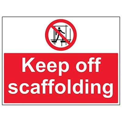 Clearly displays prohibited and potentially dangerous actions which employees and visitors must avoid in the interests of health and safety as per Health and Safety (Safety Signs & Signals) Regulations 1996 Conforms to EN ISO 7010:2012 - Prohibition signs feature a red circular symbol of at least 35% of the total sign area, on a white background, with a black pictogram Landscape Orientation. Sign reads "Keep Off Scaffolding" Highly durable Self Adhesive Vinyl material and screen printed message will stand the test of time Sign measures 600 x 450mm. Self Adhesive material will adhere securely to most surfaces
