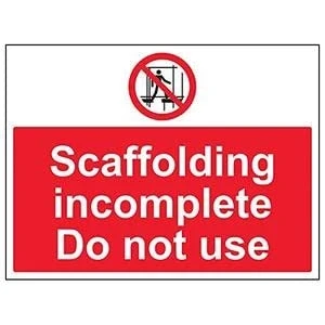 Clearly displays prohibited and potentially dangerous actions which employees and visitors must avoid in the interests of health and safety as per Health and Safety (Safety Signs & Signals) Regulations 1996 Conforms to EN ISO 7010:2012 - Prohibition signs feature a red circular symbol of at least 35% of the total sign area, on a white background, with a black pictogram Landscape Orientation. Sign reads "Scaffolding Incomplete. Do Not Use" Highly durable 1mm plastic material and screen printed message will stand the test of time Sign measures 400 x 300mm.