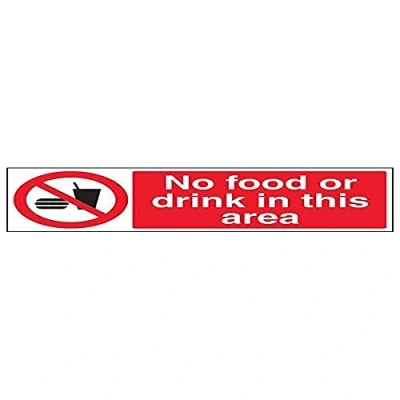 Clearly displays prohibited and potentially dangerous actions which employees and visitors must avoid in the interests of health and safety as per Health and Safety (Safety Signs & Signals) Regulations 1996 Conforms to EN ISO 7010:2012 - Prohibition signs feature a red circular symbol of at least 35% of the total sign area, on a white background, with a black pictogram Landscape Orientation. Sign reads "No Food or Drink In This Area" Highly durable Self Adhesive Vinyl material and screen printed message will stand the test of time Sign measures 450 x 150mm. Self Adhesive material will adhere securely to most surfaces