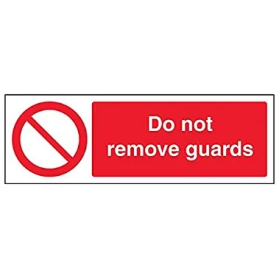 Clearly displays prohibited and potentially dangerous actions which employees and visitors must avoid in the interests of health and safety as per Health and Safety (Safety Signs & Signals) Regulations 1996 Conforms to EN ISO 7010:2012 - Prohibition signs feature a red circular symbol of at least 35% of the total sign area, on a white background, with a black pictogram Landscape Orientation. Sign reads "Do Not Remove Guards" Highly durable Self Adhesive Vinyl material and screen printed message will stand the test of time Sign measures 300 x 100mm. Self Adhesive material will adhere securely to most surfaces
