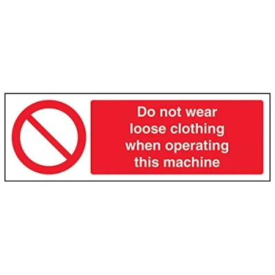 Clearly displays prohibited and potentially dangerous actions which employees and visitors must avoid in the interests of health and safety as per Health and Safety (Safety Signs & Signals) Regulations 1996 Conforms to EN ISO 7010:2012 - Prohibition signs feature a red circular symbol of at least 35% of the total sign area, on a white background, with a black pictogram Landscape Orientation. Sign reads "Do Not Wear Loose Clothing When Operating This Machine" Highly durable 1mm plastic material and screen printed message will stand the test of time Sign measures 300 x 100mm.