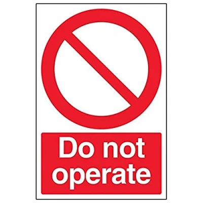 Clearly displays prohibited and potentially dangerous actions which employees and visitors must avoid in the interests of health and safety as per Health and Safety (Safety Signs & Signals) Regulations 1996 Conforms to EN ISO 7010:2012 - Prohibition signs feature a red circular symbol of at least 35% of the total sign area, on a white background, with a black pictogram Portrait Orientation. Sign reads "Do Not Operate" Highly durable Self Adhesive Vinyl material and screen printed message will stand the test of time Sign measures 200 x 300mm. Self Adhesive material will adhere securely to most surfaces