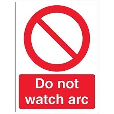 Clearly displays prohibited and potentially dangerous actions which employees and visitors must avoid in the interests of health and safety as per Health and Safety (Safety Signs & Signals) Regulations 1996 Conforms to EN ISO 7010:2012 - Prohibition signs feature a red circular symbol of at least 35% of the total sign area, on a white background, with a black pictogram Portrait Orientation. Sign reads "Do Not Watch Arc" Highly durable Self Adhesive Vinyl material and screen printed message will stand the test of time Sign measures 150 x 200mm. Self Adhesive material will adhere securely to most surfaces