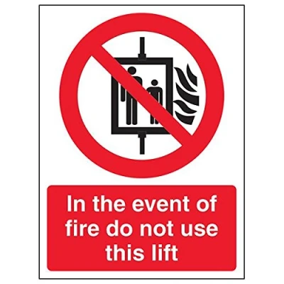 Clearly displays prohibited and potentially dangerous actions which employees and visitors must avoid in the interests of health and safety as per Health and Safety (Safety Signs & Signals) Regulations 1996 Conforms to EN ISO 7010:2012 - Prohibition signs feature a red circular symbol of at least 35% of the total sign area, on a white background, with a black pictogram Portrait Orientation. Sign reads "In The Event Of Fire Do Not Use This Lift" Highly durable Self Adhesive Vinyl material and screen printed message will stand the test of time Sign measures 150 x 200mm. Self Adhesive material will adhere securely to most surfaces