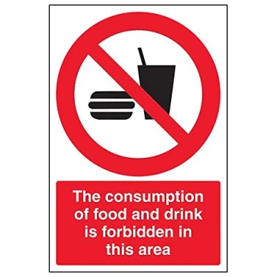 Clearly displays prohibited and potentially dangerous actions which employees and visitors must avoid in the interests of health and safety as per Health and Safety (Safety Signs & Signals) Regulations 1996 Conforms to EN ISO 7010:2012 - Prohibition signs feature a red circular symbol of at least 35% of the total sign area, on a white background, with a black pictogram Portrait Orientation. Sign reads "The Consumption Of Food And Drink Is Forbidden In This Area" Highly durable 1mm plastic material and screen printed message will stand the test of time Sign measures 200 x 300mm.