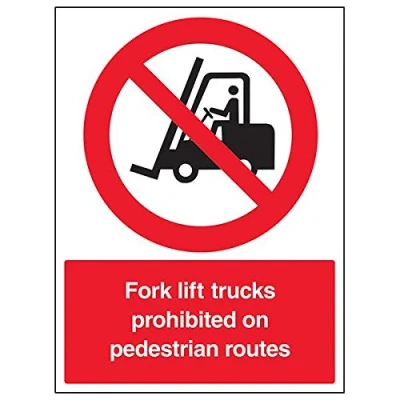 Clearly displays prohibited and potentially dangerous actions which employees and visitors must avoid in the interests of health and safety as per Health and Safety (Safety Signs & Signals) Regulations 1996 Conforms to EN ISO 7010:2012 - Prohibition signs feature a red circular symbol of at least 35% of the total sign area, on a white background, with a black pictogram Portrait Orientation. Sign reads "Fork Lift Trucks Prohibited On Pedestrian Routes" Highly durable 1mm plastic material and screen printed message will stand the test of time Sign measures 300 x 400mm.