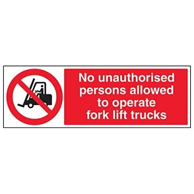 Clearly displays prohibited and potentially dangerous actions which employees and visitors must avoid in the interests of health and safety as per Health and Safety (Safety Signs & Signals) Regulations 1996 Conforms to EN ISO 7010:2012 - Prohibition signs feature a red circular symbol of at least 35% of the total sign area, on a white background, with a black pictogram Landscape Orientation. Sign reads "No Unauthorised Persons Allowed To Operate Fork Lift Trucks" Highly durable Self Adhesive Vinyl material and screen printed message will stand the test of time Sign measures 600 x 200mm. Self Adhesive material will adhere securely to most surfaces