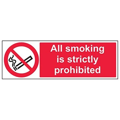 Clearly establishes areas where smoking is prohibited to employees and visitors. Complies with the Smoke-free (Signs) Regulations 2007 Conforms to EN ISO 7010:2012 - Prohibition signs feature a red circular symbol of at least 35% of the total sign area, on a white background, with a black pictogram Landscape Orientation. Sign reads "All Smoking Is Strictly Prohibited" Highly durable 1mm plastic material and screen printed message will stand the test of time Sign measures 600 x 200mm.