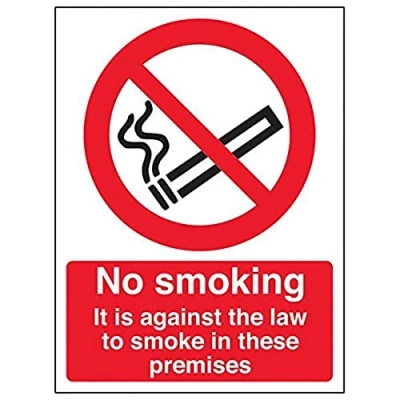 Clearly establishes areas where smoking is prohibited to employees and visitors. Complies with the Smoke-free (Signs) Regulations 2007 Conforms to EN ISO 7010:2012 - Prohibition signs feature a red circular symbol of at least 35% of the total sign area, on a white background, with a black pictogram Portrait Orientation. Sign reads "No Smoking. It Is Against The Law To Smoke In These Premises" Highly durable Self Adhesive Vinyl material and screen printed message will stand the test of time Sign measures 150 x 200mm. Self Adhesive material will adhere securely to most surfaces