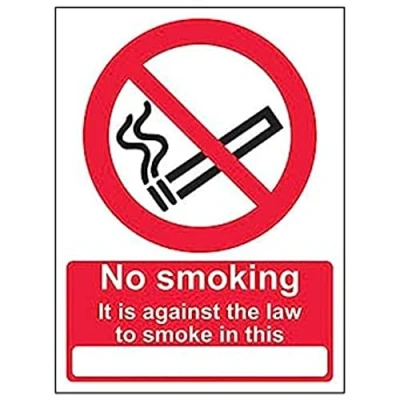 Clearly establishes areas where smoking is prohibited to employees and visitors. Complies with the Smoke-free (Signs) Regulations 2007 Conforms to EN ISO 7010:2012 - Prohibition signs feature a red circular symbol of at least 35% of the total sign area, on a white background, with a black pictogram Portrait Orientation. Sign reads "No Smoking. It Is Against The Law To Smoke In This" Highly durable Self Adhesive Vinyl material and screen printed message will stand the test of time Sign measures 150 x 200mm. Self Adhesive material will adhere securely to most surfaces