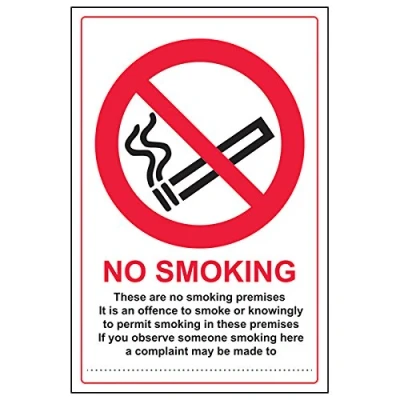Clearly establishes areas where smoking is prohibited to employees and visitors. Complies with the Smoke-free (Signs) Regulations 2007 Conforms to EN ISO 7010:2012 - Prohibition signs feature a red circular symbol of at least 35% of the total sign area, on a white background, with a black pictogram Portrait Orientation. Sign reads "No Smoking. These Are No Smoking Premises. If You Observe Someone Smoking Here, A Complaint May Be Made To" Highly durable Self Adhesive Vinyl material and screen printed message will stand the test of time Sign measures 200 x 300mm. Self Adhesive material will adhere securely to most surfaces