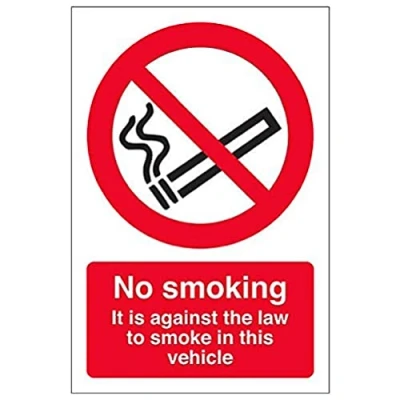 Clearly establishes areas where smoking is prohibited to employees and visitors. Complies with the Smoke-free (Signs) Regulations 2007 Conforms to EN ISO 7010:2012 - Prohibition signs feature a red circular symbol of at least 35% of the total sign area, on a white background, with a black pictogram Portrait Orientation. Sign reads "No Smoking. It Is Against The Law To Smoke In This Vehicle" Highly durable Window Sticker material and screen printed message will stand the test of time